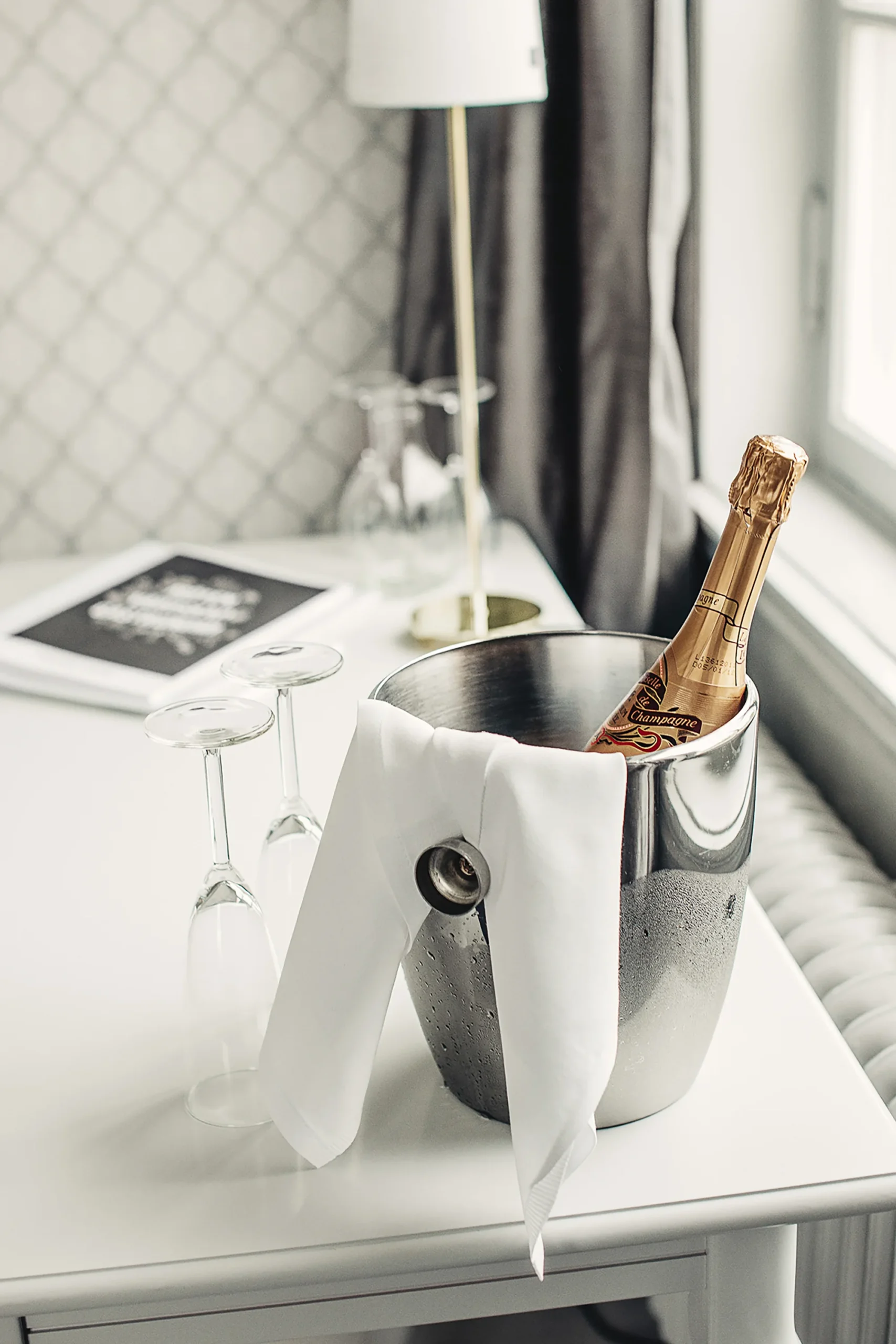 * 2 glas champagne, 1 glas till förrätt, 2 glas till varmrätt, 1 glas till dessert och 3 cl avec till kaffet